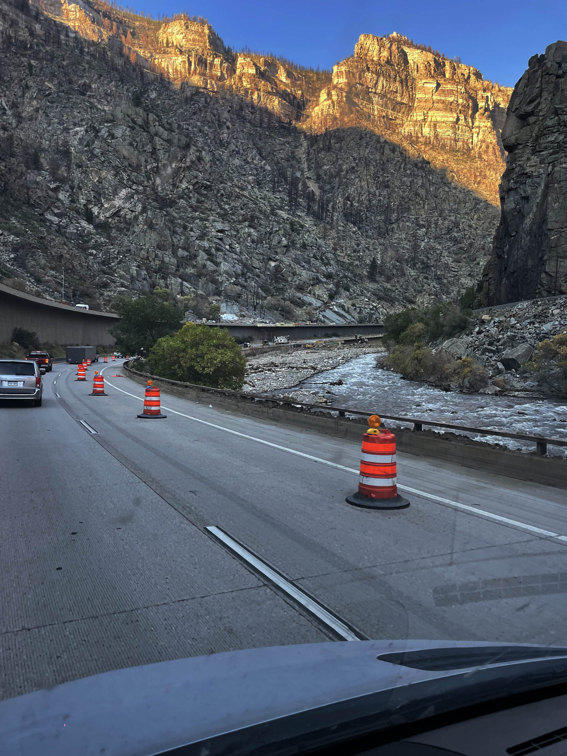 I-70 In the mountain pass west of Denver. Along the Colorado River. Road damage from a landslide August 2021 that dammed the river, which in turn flooded the Interstate. The repairs are still under construction. This lead to a very long drive day. Not returning home this route!